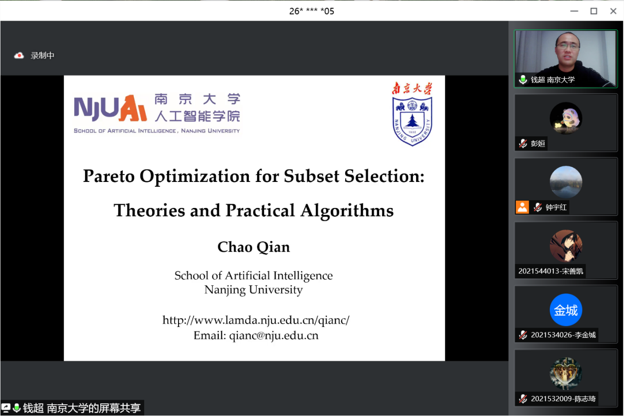 上半场,钱超老师以子集选择为题,讲述了子集选择的应用案例及多目标演化算法求解子集选择的问题。钱老师首先以传感器选择、自然语言处理中的文本摘要等为例,向同学们生动展示了什么是子集选择及其解决的问题。随后,钱老师介绍了子集问题的优化解决算法的进化过程——单目标优化、双目标优化、多目标优化。最后,针对子集选择的Pareto优化方法,老师分别深入介绍了具体案例改进的大规模子集选择、带噪子集选择、动态子集选择的Pareto优化算法。至此,会议上半程国产av影片子集选择问题的学术分享圆满结束。