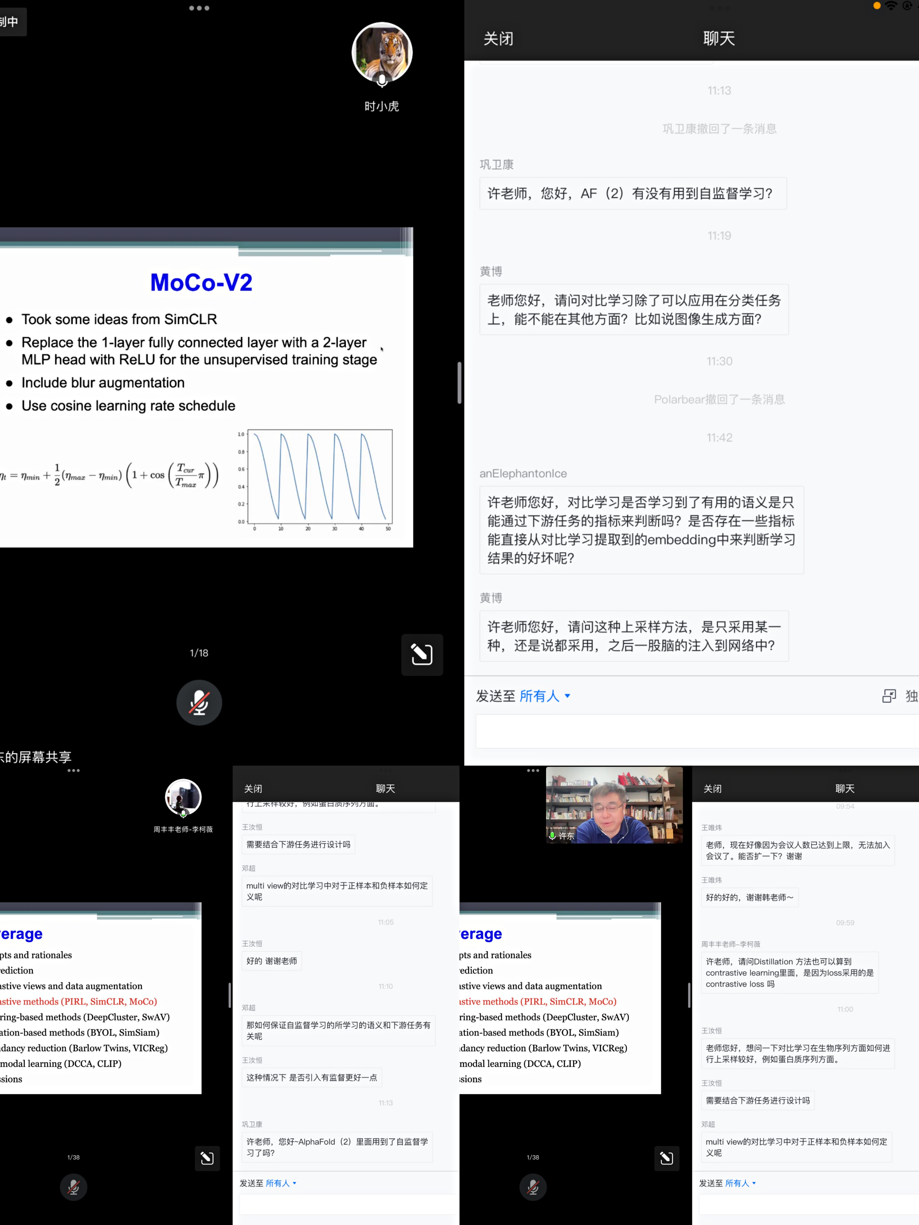 在报告的最后,许东教授给出了自监督学习与监督学习性能上直观的比较,说明了自监督学习更优的原因,从不同角度对现有的自监督学习的模型进行了分类并指出了未来自监督学习的发展方向以及目前所遇到的挑战。在讲座中及讲座后的讨论时间里,许东教授悉心回答了老师和同学们的问题。首日超过300位同学和老师参加了本次报告,并受到了国产av影片