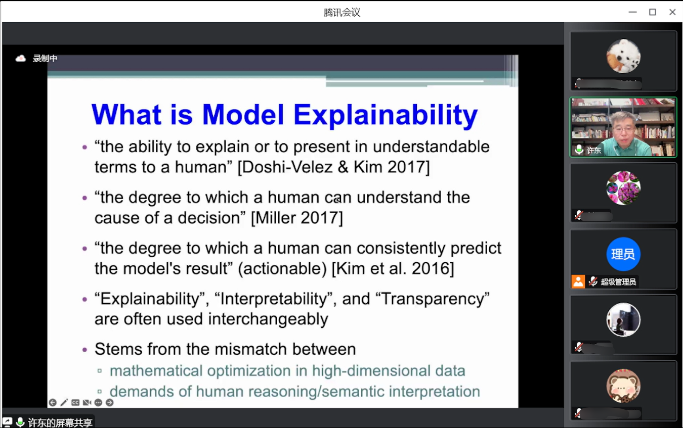 近些年来,随着相关领域的发展,深度学习模型已经表现出优越的性能和潜力,然而,受可解释性的限制,深度学习常常被认为“黑盒”。目前,可解释的人工智能(Explainable AI, XAI)以“为模型提供可解释性进而提升模型表现”为目标与主题,已经引起了广泛的研究并取得了卓越成就。在本次报告中,许东教授从XAI的范畴开始,由浅入深地带领大家学习了典型的模型无关方法如LIME和SHAP,而后,许东教授详细介绍了许多基于显著图技术(Saliency Map)的模型思想来可视化关键特征信息,主要包括基于梯度的反向传播(Gradient-based Backpropagation)、反卷积网络(Deconvolutional Networks)与类激活图(Class Activation Maps, CAMs)等。同时,许东教授讲解了基于注意力机制的相关模型如Transformer和BERT等。报告的最后,许东教授热情地与同学们展开互动,并就同学和老师们的问题进行了详尽的解答。本次报告受到了广大师生的热烈响应和强烈反响。