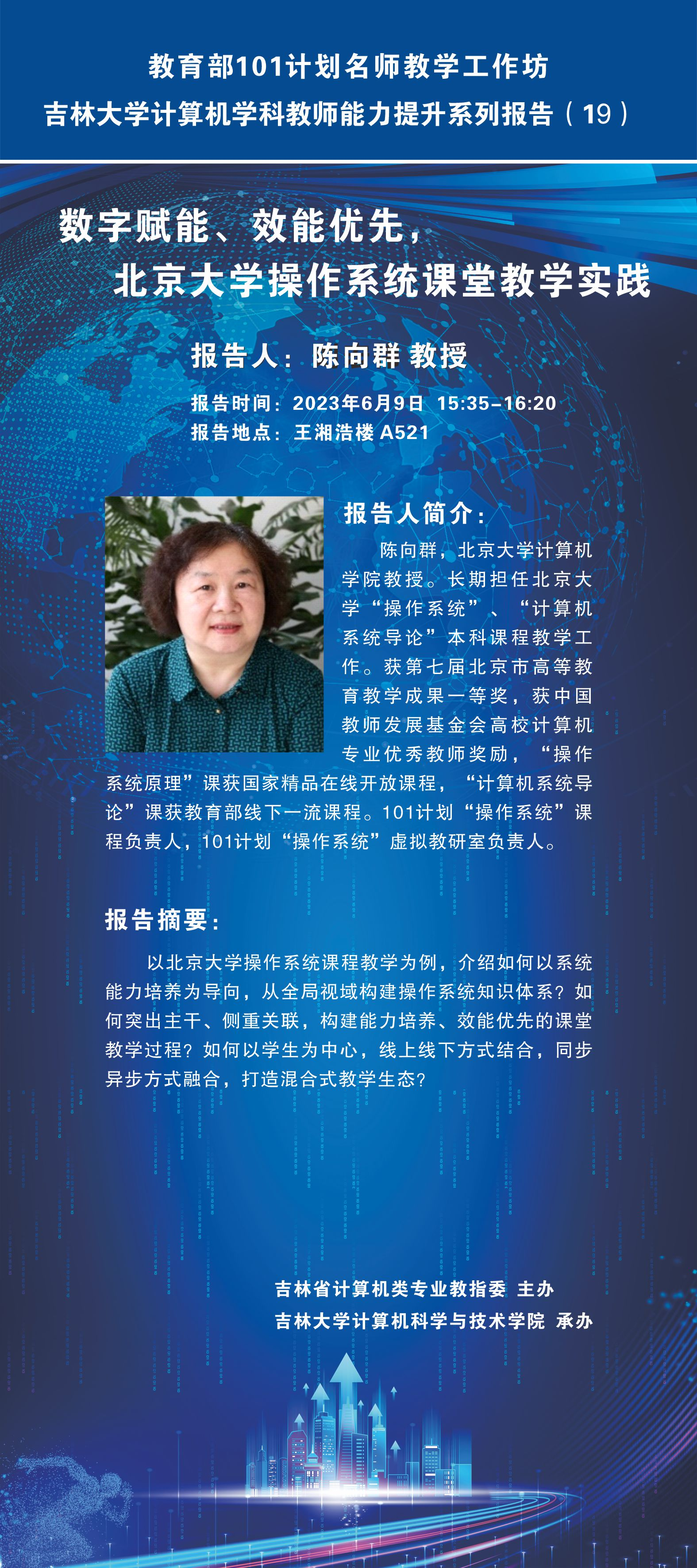 第三场报告是陈向群教授带来的名为《数字赋能、效能优先,北京大学操作系统课堂教学实践》的报告,以北京大学操作系统课程教学为例,介绍如何以系统能力培养为导向,从全局视域构建操作系统知识体系? 如何突出主干、侧重关联,构建能力培养、效能优先的课堂教学过程?如何以学生为中心,线上线下方式结合,同步异步方式融合,打造混合式教学生态?