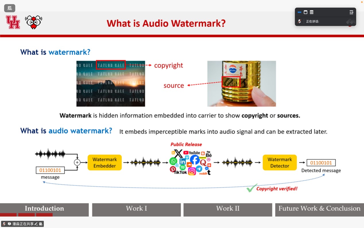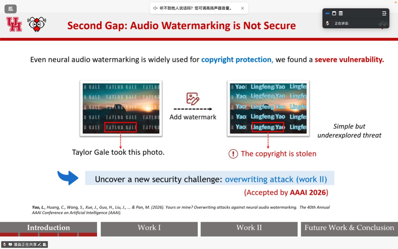 在报告中,潘淼教授首先介绍了智能音频水印技术的研究背景及其在数字版权保护领域的重要性。随后,他深入剖析了当前智能音频水印机制的验证方法,重点探讨了现有技术在面对恶意攻击时存在的安全脆弱性。潘教授结合其团队的最新研究成果,详细展示了如何识别这些漏洞,并提出了增强水印鲁棒性的潜在技术路径,为相关领域的安全研究提供了新的视角和思路。