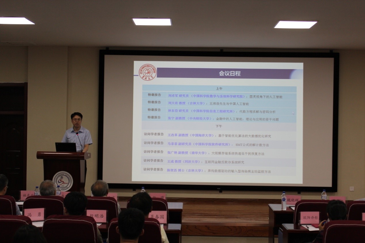 6月10日上午,吴文俊院士生前优秀博士毕业生、中国科学院数学与系统数学研究院创始副院长、符号实验室学术委员会委员刘卓军研究员,吉林大学符号实验室学术委员会副主任刘大有教授,信息安全国家重点实验室常务副主任、中国科学院信息工程研究所林东岱研究员和中国科学院数学与系统科学研究院数学机械化研究中心优秀博士毕业生、中央财经大学张宁副教授分别作了报告。刘卓军研究员的报告题目是“图灵视角下的人工智能”,他简要介绍了吴文俊的生平,回顾了吴文俊院士在定理机器方面做出的杰出贡献,然后从图灵的视角对人工智能的发展进行了深入的分析。他进一步指出,在人工智能蓬勃发展的今天,大学和研究机构更应坚持在基础理论和算法研究上发力,有积累进而才有机会,吴文俊、王湘浩等老一代科学家的远见卓识必将伴随着中国人工智能事业深入发展而彰显更大的价值。刘大有教授的报告题目是“王湘浩先生与中国人工智能”,他深情回顾了中国人工智能奠基人、杰出数学家、教育家、计算机科学家、红学家、吉林大学计算机学科奠基人王湘浩院士的壮丽人生,并重点介绍其在关键时刻与吴文俊院士、陆汝钤院士共同为推动中国人工智能发展所做出的卓越贡献。刘东岱研究员的报告题目是“代数方程求解与密码分析”,报告从流密码算法的代数攻击出发,介绍代数攻击的思想、方法以及由此产生的密码设计新准则。张宁副教授的报告题目是“金融中的人工智能:理论与应用的若干问题”,报告基于讲者在人工智能在金融方面应用的相关理论和应用的工作经验,从行业角度、学术角度和监管角度对两者融合提出了12个问题,并对这些问题在不同程度上提供了一些解决途径、探索和思考。