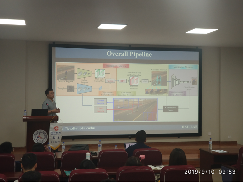 在报告中,王栋老师提到,近年来在线视觉跟踪研究已取得突破性进展,跟踪精度和速度在OTB和VOT等短时跟踪数据库上均取得了非常出色的表现。然而,针对长时视觉跟踪问题的研究及相关Benchmark的建立刚刚起步。长时视觉跟踪不仅包含传统跟踪问题中的难点而且存在目标频繁消失并重新出现这一新的挑战。因此,要求跟踪算法同时具备短时精准快速跟踪和长时全图重找回的能力,以及判断目标是否被跟踪或已丢失的能力。在本次报告中,王老师以其团队在VOT2018长时比赛冠军算法和ICCV2019最新接收论文为基础,介绍了长时视觉跟踪前沿进展以及深度学习算法在长时目标跟踪问题上的初步探索。本次报告受到在场师生们的一致好评。