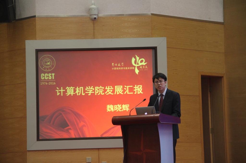 最后,计算机学院院长魏晓辉教授向大家汇报计算机学院发展历程。他按时间顺序从建系前期、建系与发展、院系合并、发展现状等方面回顾了学院的历史及发展,介绍了学院现有的18个研究团队和5个研究方向,并指出了学院所取得的成绩和存在的不足。感谢兄弟院校和学校领导的大力支持。号召全院师生凝心聚力、改革创新、立志图强,为把吉林大学计算机学科建设成为世界一流学科而努力奋斗!