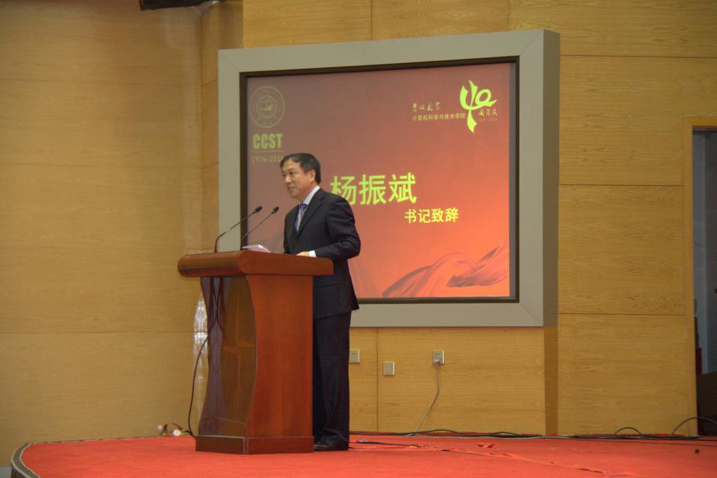 吉林大学党委书记杨振斌致辞。他代表学校和校长李元元院士向计算机学院全体师生及海内外校友表示热烈祝贺,向各位来宾表示诚挚的欢迎。对王湘浩教授创建吉林大学计算机学院及在人工智能领域做出的贡献给予高度评价,并对吉林大学计算机学院在学科建设、人才培养、科学研究、服务社会方面取得的长足进步给予了肯定。杨振斌表示,学校将一如既往地支持计算机学院发展,希望计算机学院全体师生开拓创新,继承和发扬王湘浩院士等前辈的优良传统,紧紧围绕学校中长期改革和发展规划纲要,积极落实学校“学术立校、人才强校、创新兴校、开放活校、文化荣校”五大战略,发挥计算机学科交叉能力强的优势,促进学校核心竞争力的提高,为吉林大学的快速发展和国家振兴而努力奋斗。