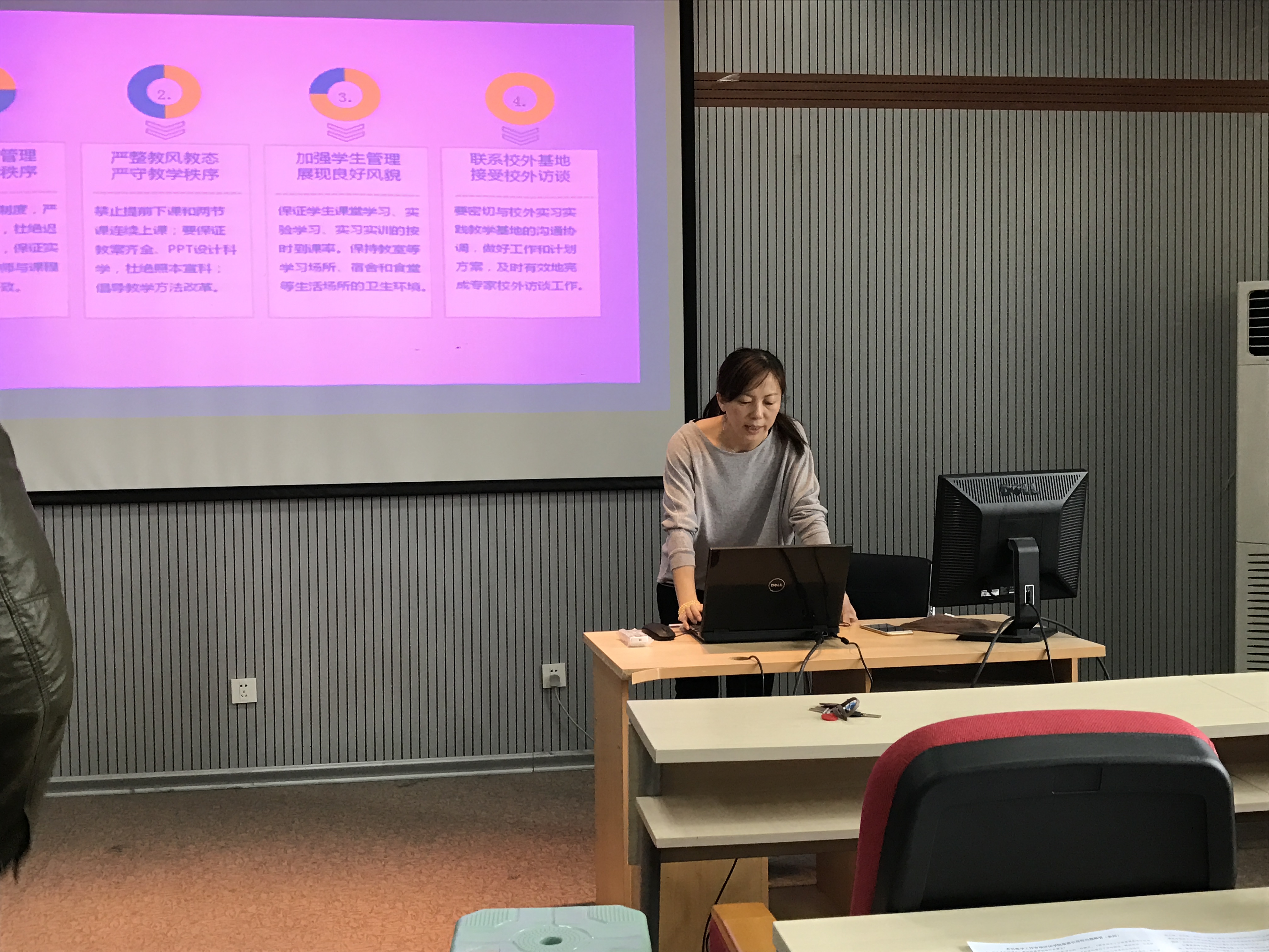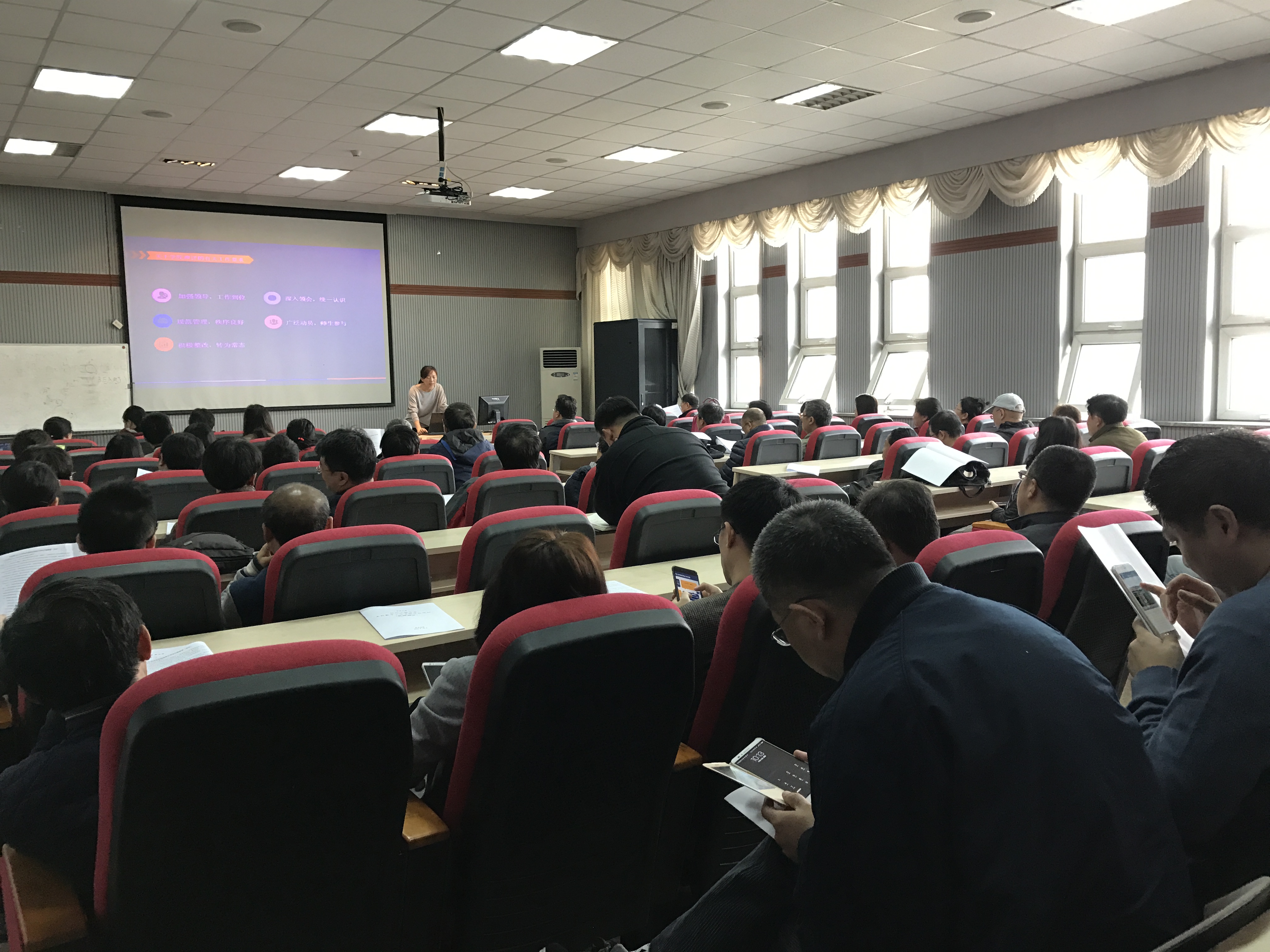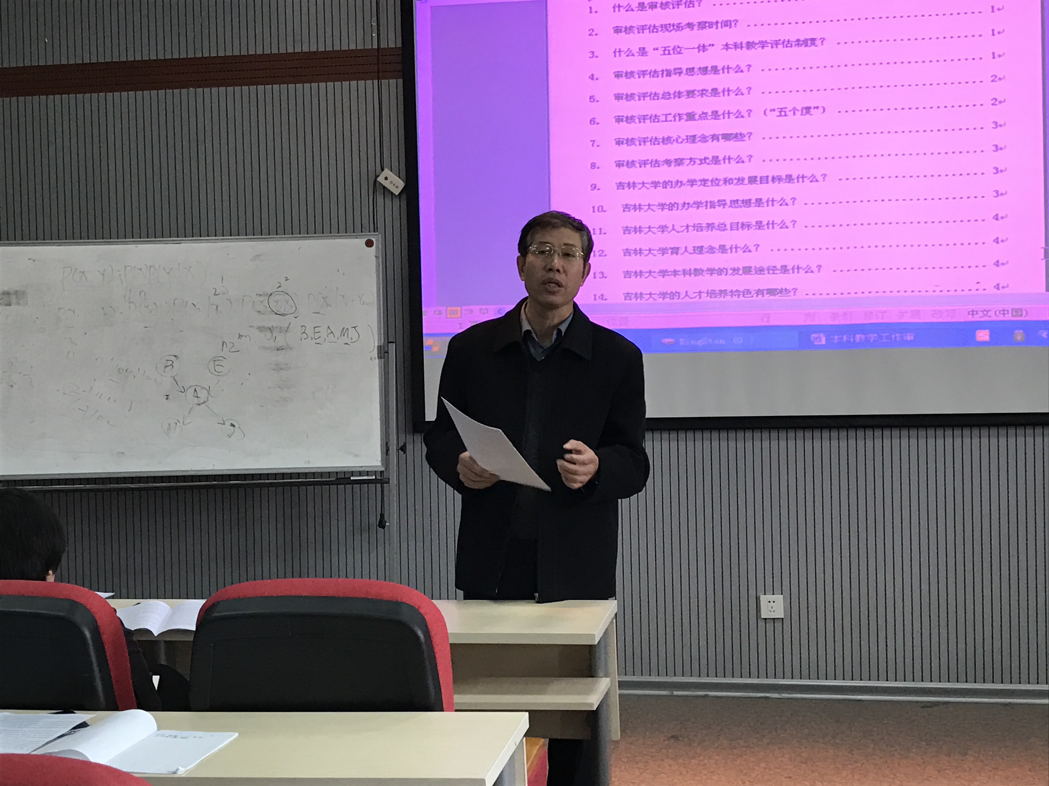 教学副院长黄岚教授首先介绍了审核评估的基本情况,以及学校的迎评工作部署。之后,黄岚教授和软件学院教学副院长杨永健教授分别介绍了前期院内自评、校内自评的工作成果,并根据学校部属,结合学院的具体情况,对评估现场考查工作进行了安排。最后,分别对两院的相关文件进行了解读并回答了老师的提问,动员各位教师保证课堂的管理规范、秩序良好,向评估专家展示吉林大学师生风采。