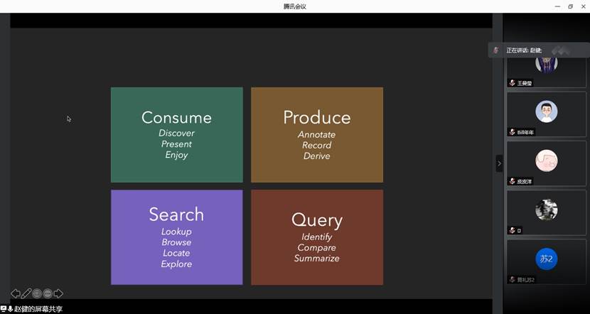讲座开始时,赵老师讲解了可视化对人类社会的重要意义,并提出了在大数据时代,好的可视化工具应该具有的三个特性:计算机层面的Predictive、人类使用层面的Interactive和数据层面的Expressive。随后,赵老师分别从Consume、Product、Search和Query四个方面介绍了团队在可视化领域所做的工作,详细讲解了每项工作的需求来源、实现方法和具体应用,并分别阐述了每项工作是如何对应上述三个特性的。
