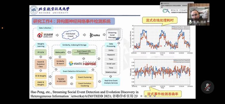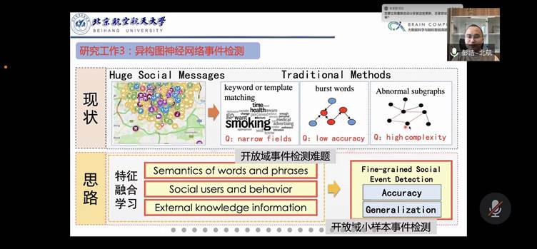 在本次报告中,彭浩老师面向社会网络信息空间大数据,由浅入深地介绍了在社交网络数据语义表征计算和社会事件检测方面的研究和系统进展,内容涵盖了增量表示学习、社会事件建模、小样本事件检测、强化图神经网络、增强流式密度聚类等方面关键技术。最后,彭老师悉心地回答老师和同学们的提问,受到了广大师生的热烈响应。