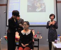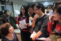 王同学做脸部模特,进行现场实例教学。此外,针对于职业装的穿着搭配知识和不同体型人适合的款式问题,王老师也进行了详细的说明。活动结束后,同学们纷纷上前交流咨询,王老师对所有问题都给予了耐心的解答并针对每个人的肤质向同学们赠送了精美礼品。