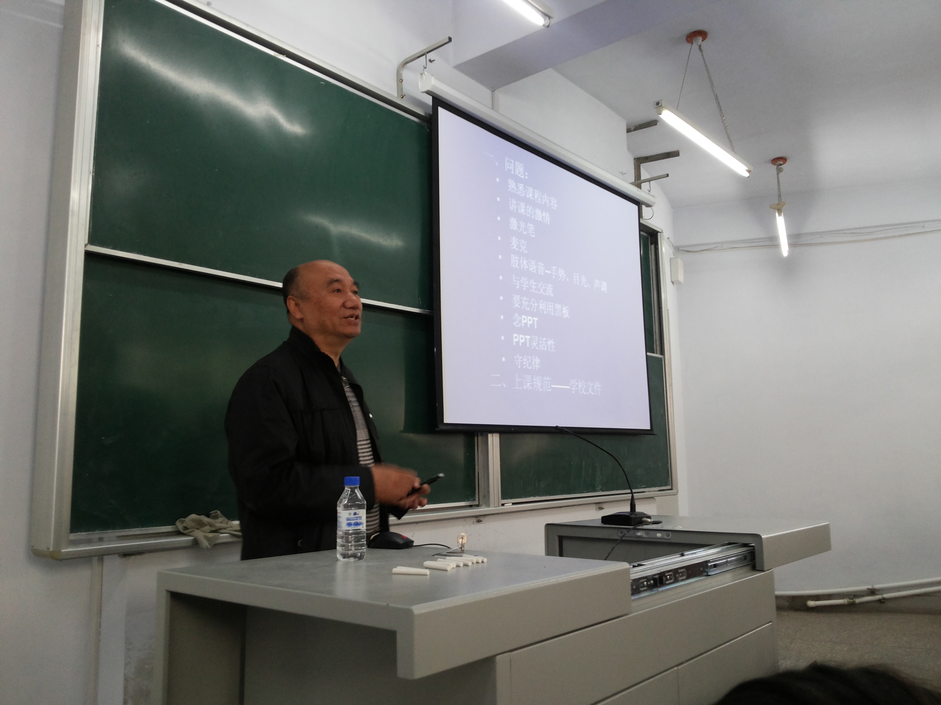 接着,张长海教授就本学期教学检查,在授课教师中普遍存在的问题进行了总结和分析。他提出,教师必须要非常熟悉课程内容;上课一定要携带激光笔并且上课前充好电;要正确使用麦克,使教室后面的学生也能听清;讲课要有激情,要注意手势、目光、声调等;上课需要与学生互动;要充分利用黑板,黑板和PPT结合使用,不要光念PPT,PPT制作要灵活,能激起学生学习兴趣;要求授课老师认真学习和遵守《吉林大学教师本科教学工作规范》和《吉林大学本(专)科教学工作事故认定及处罚条例(暂行)》等学校相关文件,遵守上课纪律。