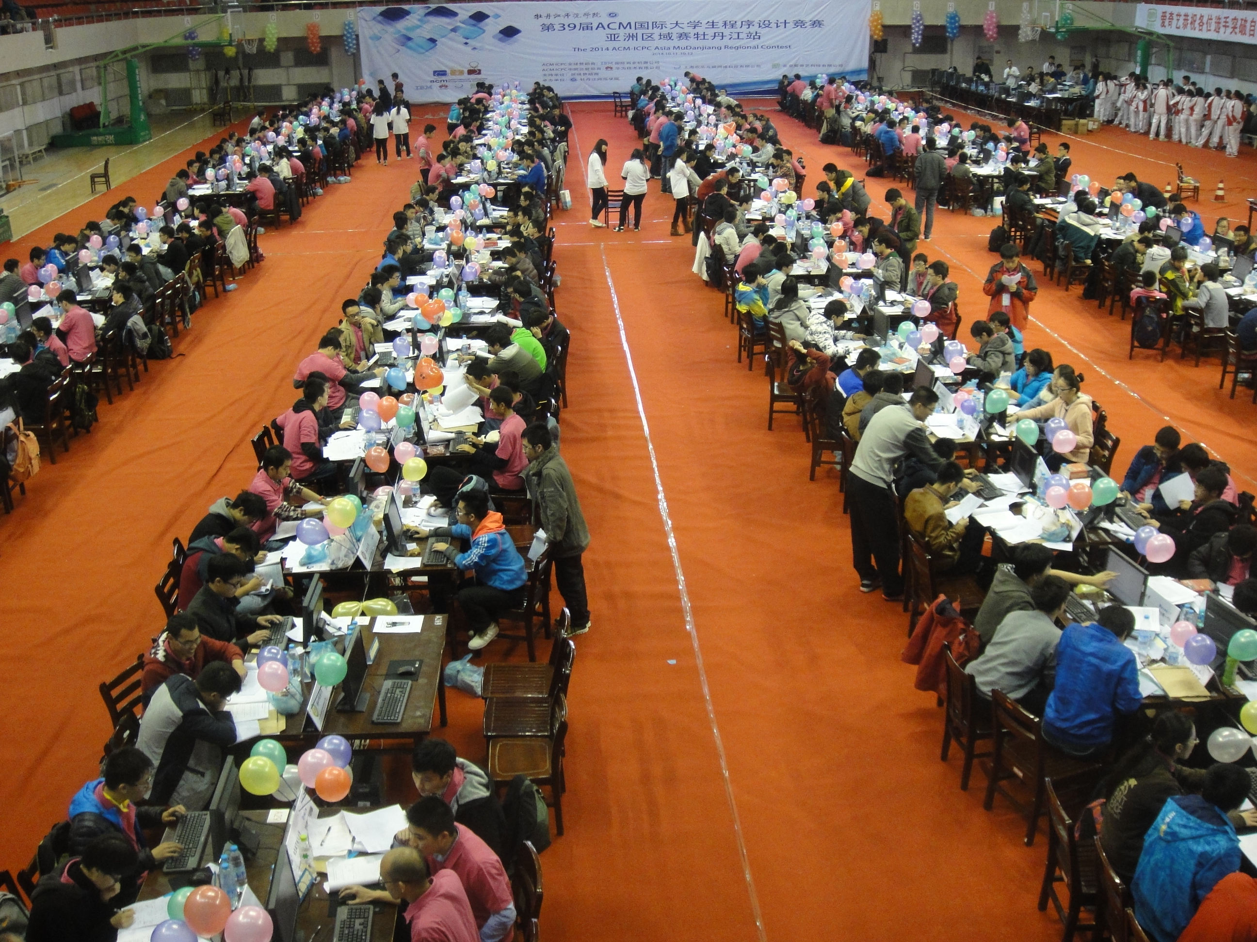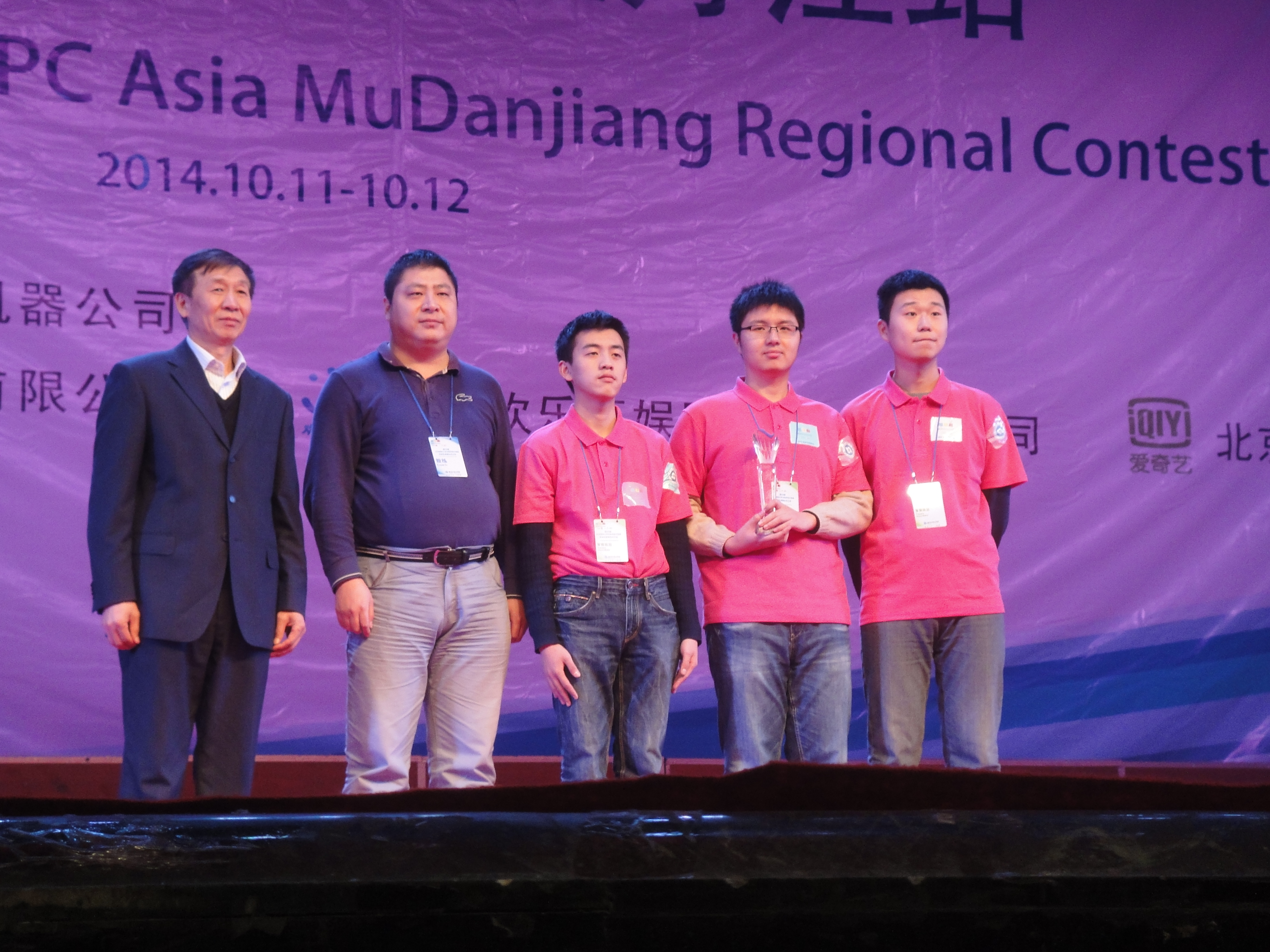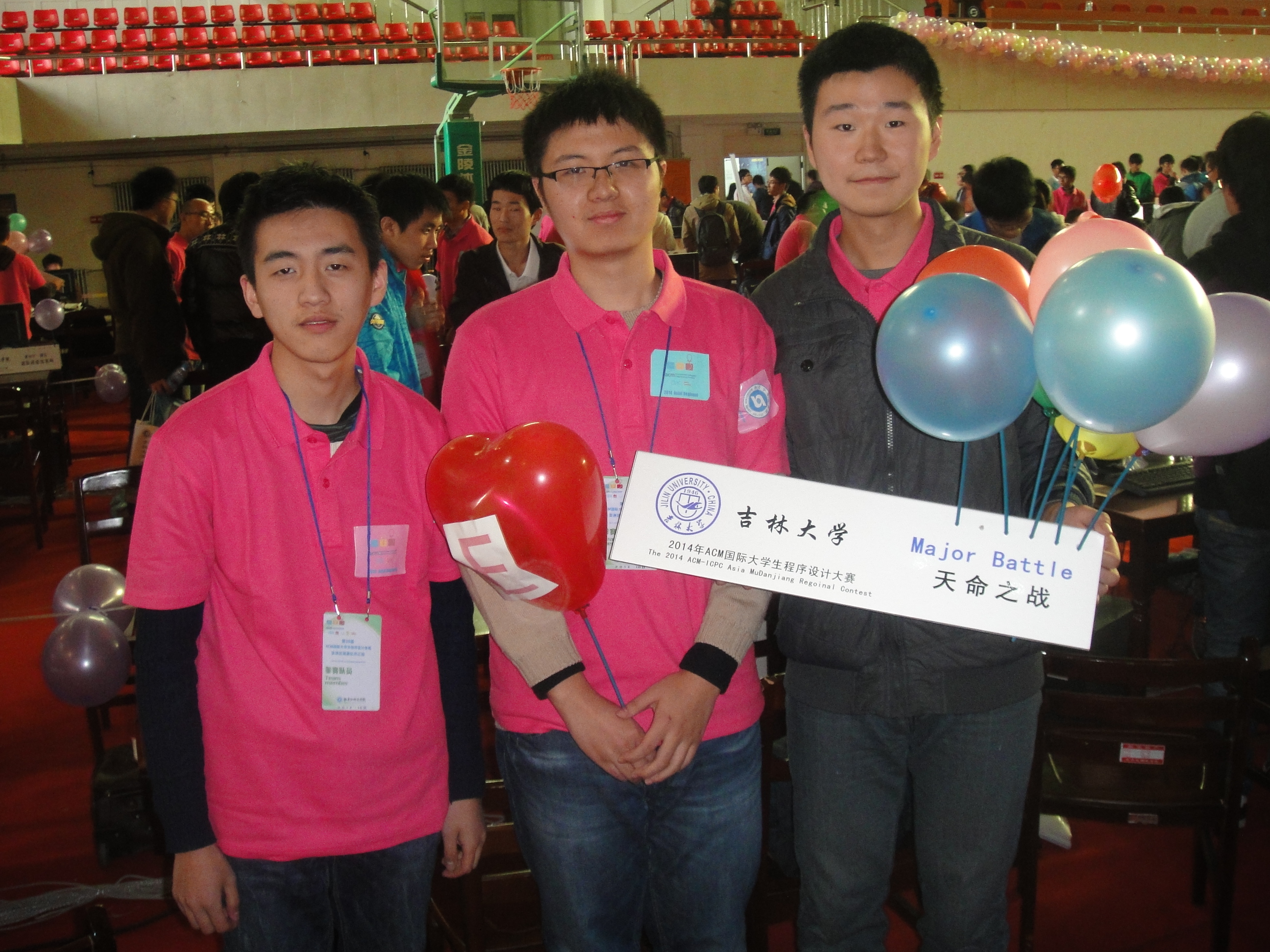 第39届ACM-ICPC国际大学生程序设计竞赛亚洲区域赛牡丹江站比赛于2014年10月11日至12日在牡丹江师范学院举行。清华大学、北京大学、复旦大学、国防科技大学、哈尔滨工业大学等91所高校的154支参赛队参加了该站的比赛。经过激烈的角逐,由我校计算机学院2013级本科生唐家铭、2012级本科生陈海敏和软件学院2012级本科生药剡组成的“天命之战”队力拔头筹,率先解出7个题目,名列第1名,获得冠军。