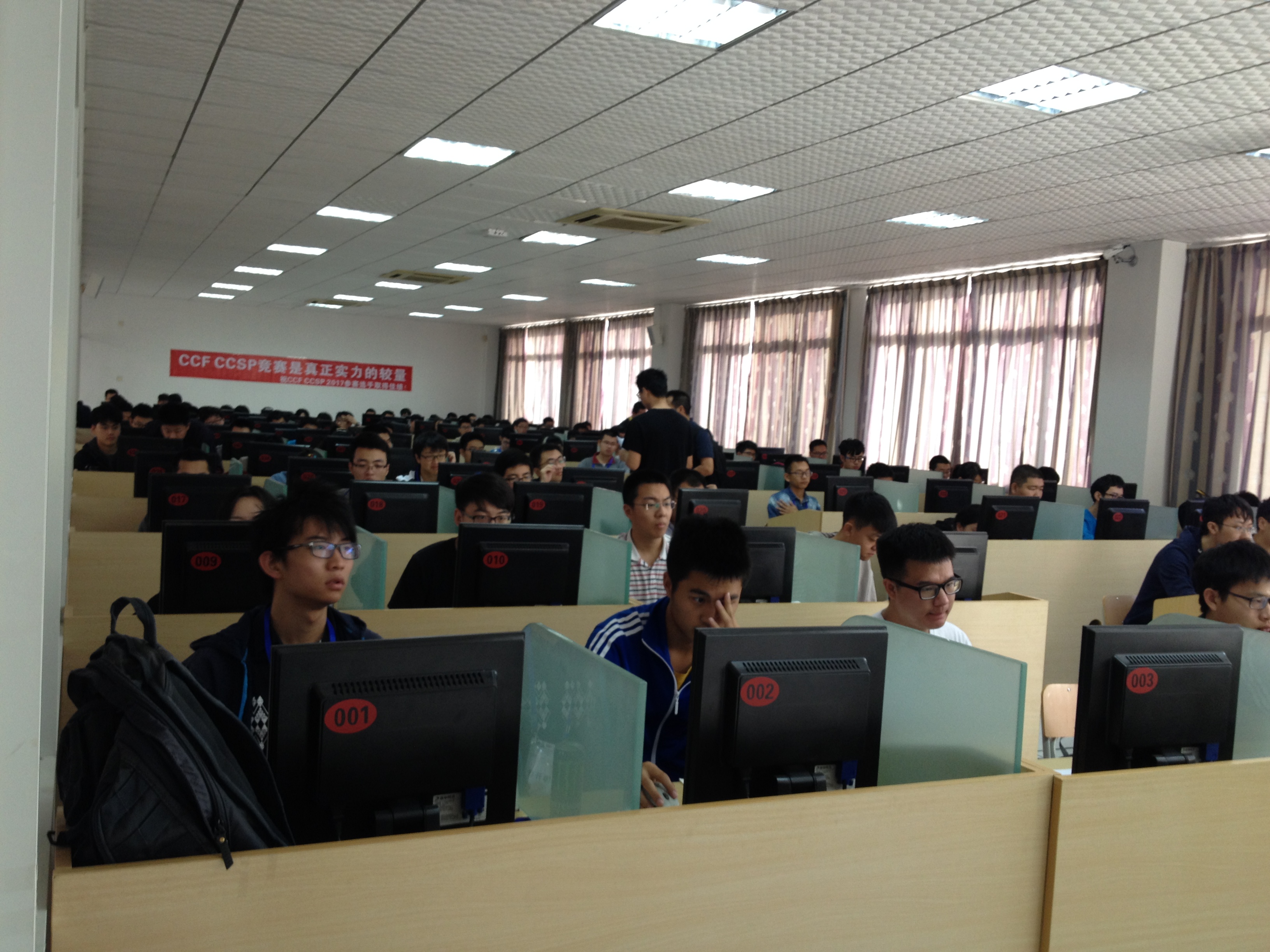 CCSP2017与中国计算机大会(CNCC2017)同时在福州举行。比赛现场在福建师范大学旗山校区笃行楼3楼机房,CNCC会场大屏幕直播比赛实况。10月26日早晨8:00选手入场,8:30比赛开始,晚上22:00比赛结束。提供充足的饮料、水果和食品,午餐和晚餐有简短的用餐间歇。比赛共历时14个小时,对智力、能力和体力都是极大的挑战。比赛结束后,学生们都很疲倦,但还略带兴奋的交流解题情况。